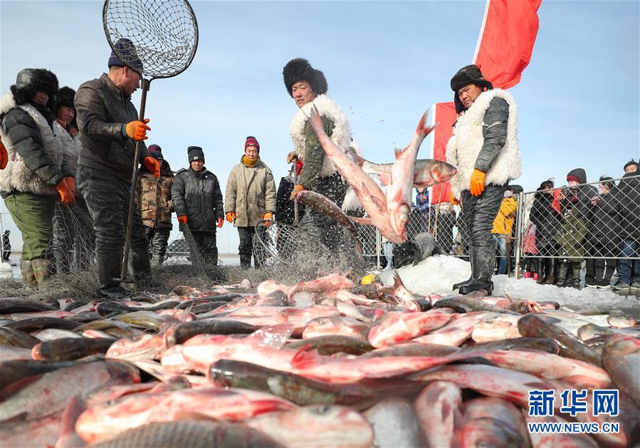漁民在臥龍湖冰面上捕魚。新華社記者龍雷攝