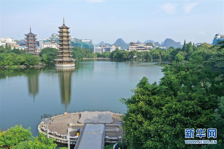 桂林市榕湖附近景觀(7月1日無人機(jī)拍攝)。 夏日時(shí)節(jié),廣西桂林市區(qū)內(nèi)的榕湖、杉湖、桂湖、木龍湖等地綠樹成蔭、景色迷人。 新華社記者陸波岸攝