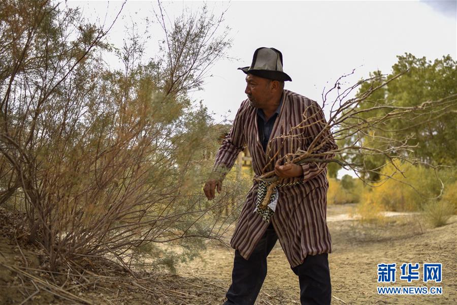 在羅布人村寨,阿木東·艾不東在準(zhǔn)備用于制作羅布烤魚的紅柳(2018年10月16日攝)。新華社記者 趙戈 攝