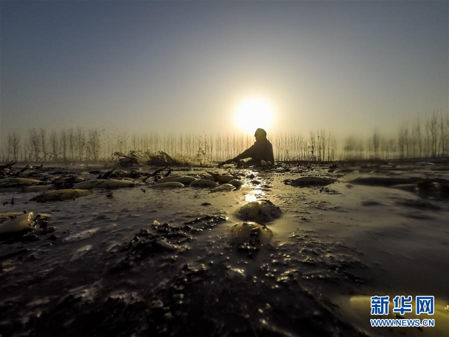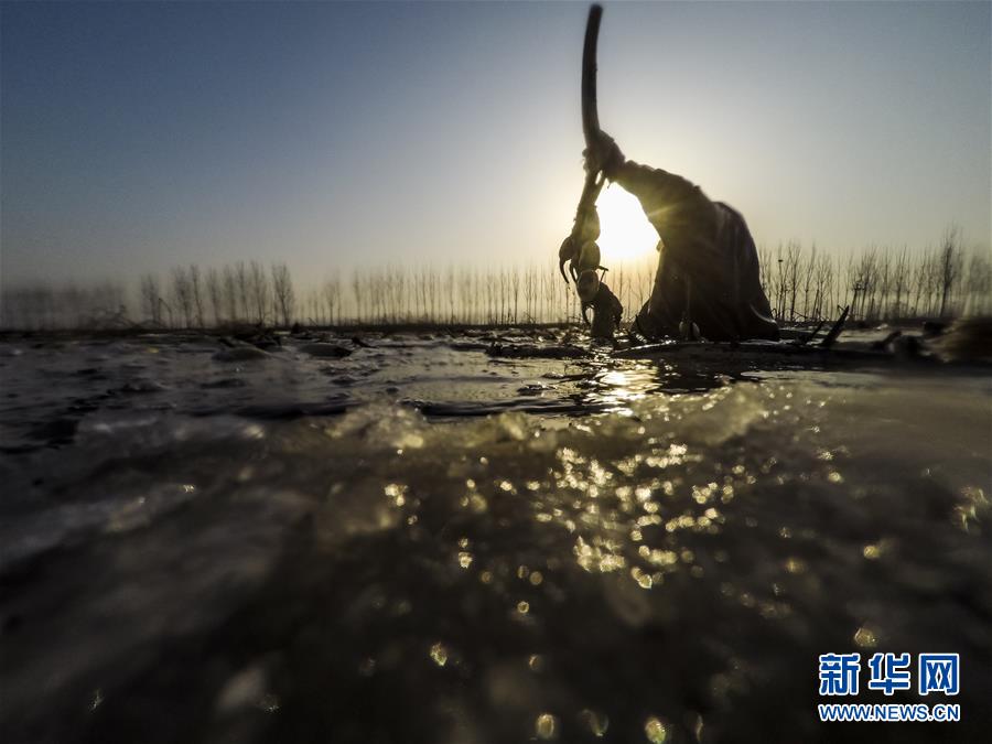 白洋淀深冬挖藕人