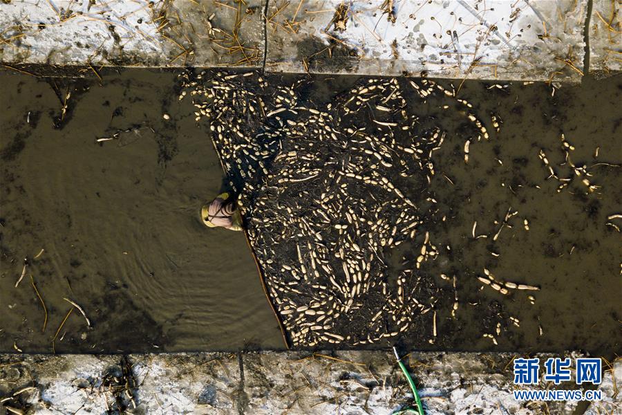1月31日,在雄安新區(qū)安新縣東向陽(yáng)村的一處藕塘,挖藕工清洗挖出來的藕(無人機(jī)航拍)。新華社記者沈伯韓攝