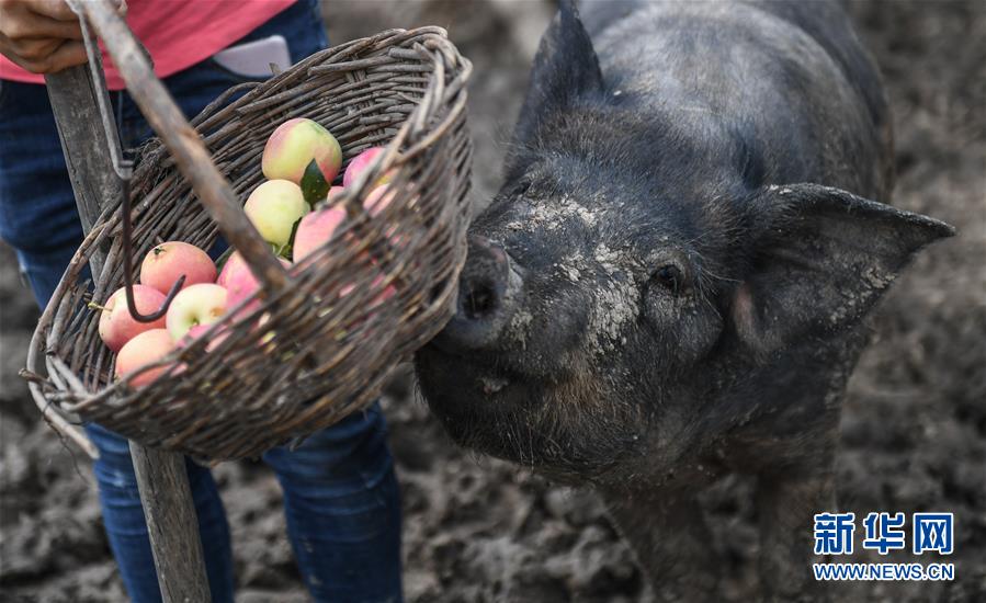 8月20日,康丹丹在接受采訪時,一頭水果香豬來搶食她籃子里的海棠果。新華社記者 王昊飛 攝