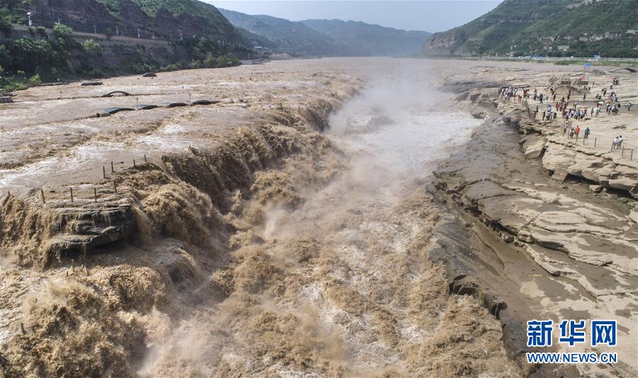 7月19日,游客在山西境內的壺口瀑布群前留影。 新華社記者陶明 攝