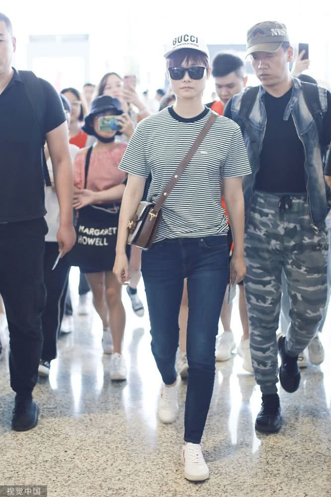李宇春條紋裝扮現身機場,青春活力,人氣爆棚