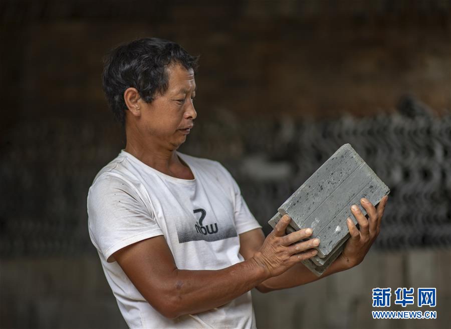 石屏縣異龍鎮(zhèn)符家營村村支書楊松在挑選準備用于修繕老屋的地磚(8月8日攝)。新華社記者 江文耀 攝