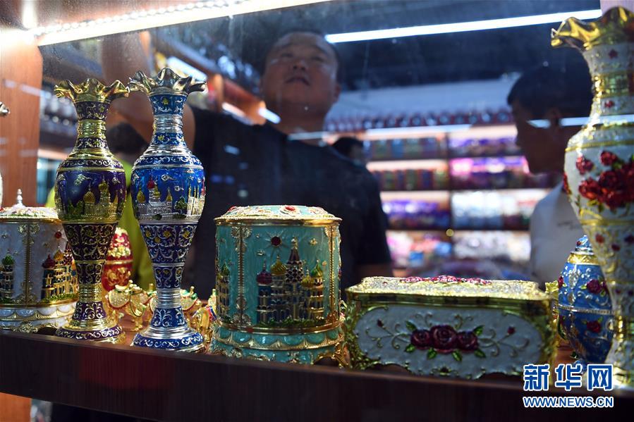 9月4日,在新疆塔城地區(qū)巴克圖口岸,顧客在絲路文化商品城內(nèi)選購商品。 新華社記者沙達(dá)提攝
