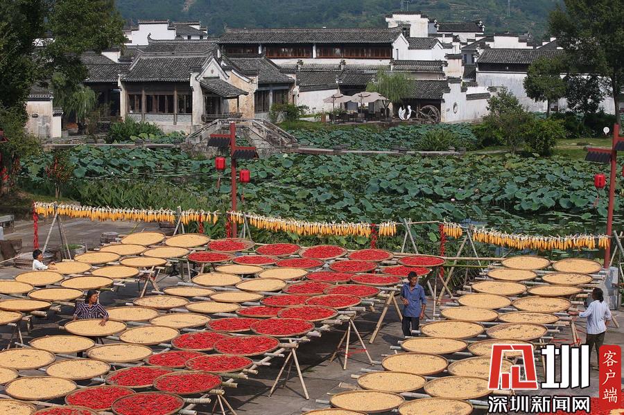 秋天,是收獲的季節(jié)。安徽省黃山市呈坎古村村民將收獲歸倉(cāng)的玉米、黃豆、紅辣椒等農(nóng)作物果實(shí)因地制宜晾曬,在古村曬場(chǎng)上描繪出一幅豐收曬秋圖。