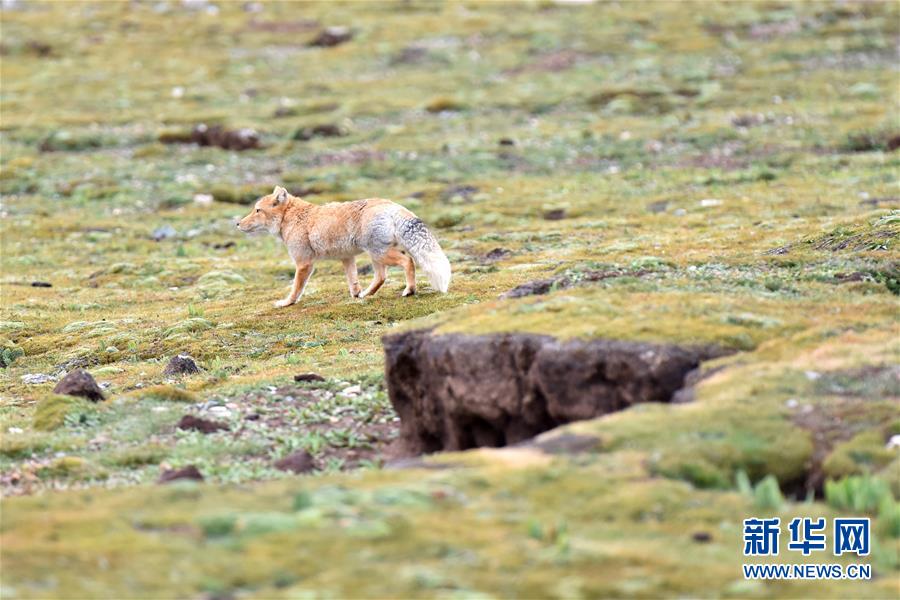 在青海省玉樹(shù)藏族自治州治多縣,一只藏狐雨后“漫步”在草場(chǎng)上(9月12日攝)。 新華社記者 孫瑞博 攝