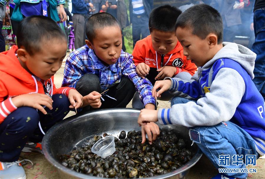 10月28日,在廣西融水苗族自治縣拱洞鄉(xiāng)龍令村,小朋友在品嘗田螺。新華社記者 黃孝邦 攝