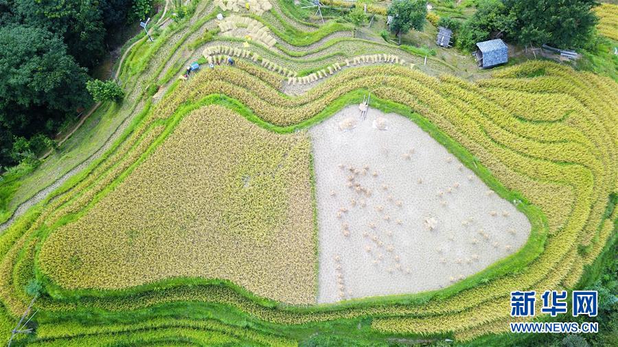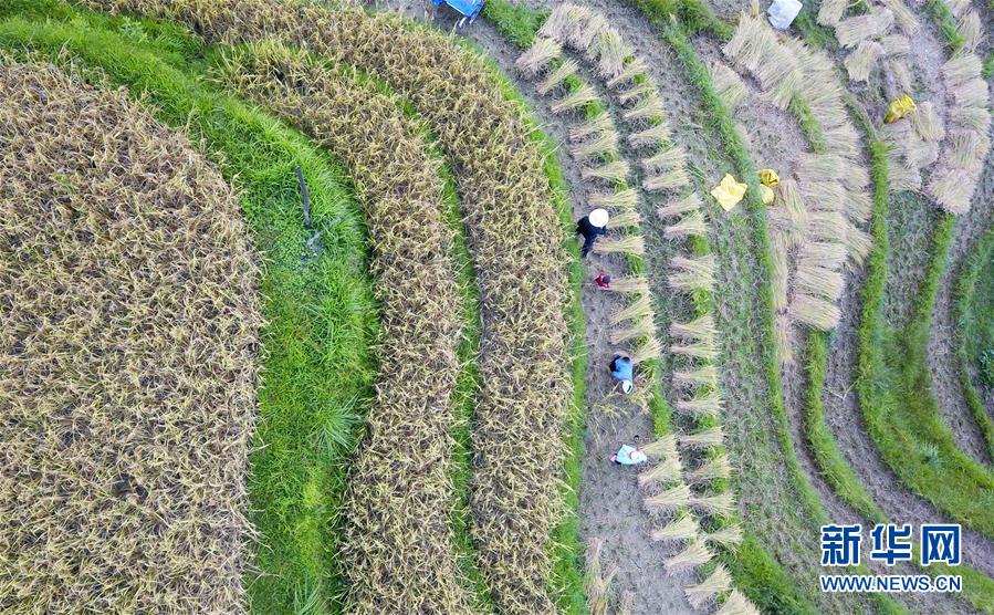 9月17日,貴州省榕江縣計(jì)劃鄉(xiāng)計(jì)劃村陽(yáng)開(kāi)苗寨的村民在收割稻谷(無(wú)人機(jī)拍攝)。新華社記者 楊文斌 攝