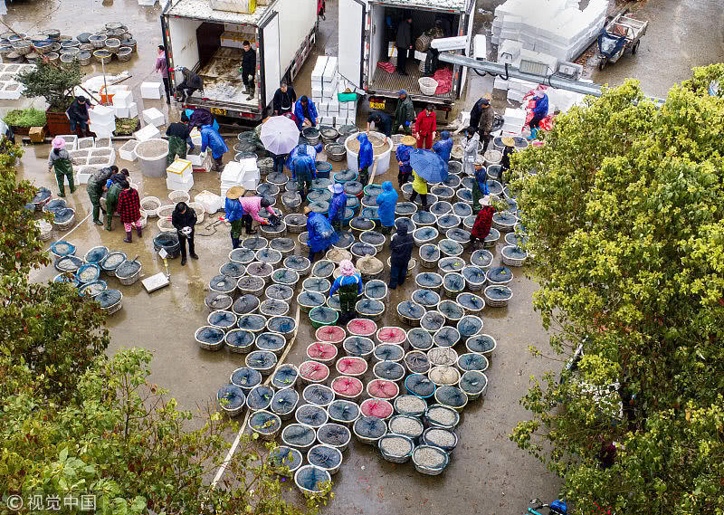 浙江臺(tái)州,三門縣花橋鎮(zhèn)柵下村的文化禮堂前,村民們冒雨和商販交易蟶苗,現(xiàn)場(chǎng)一片繁忙。據(jù)了解,花橋蟶苗屬于野生苗,存活率高,易成長(zhǎng),極受市場(chǎng)歡迎,一到捕撈季節(jié),遼寧、山東、江蘇和浙江的養(yǎng)殖戶和蟶苗小販爭(zhēng)相到花橋購(gòu)買優(yōu)質(zhì)蟶苗。