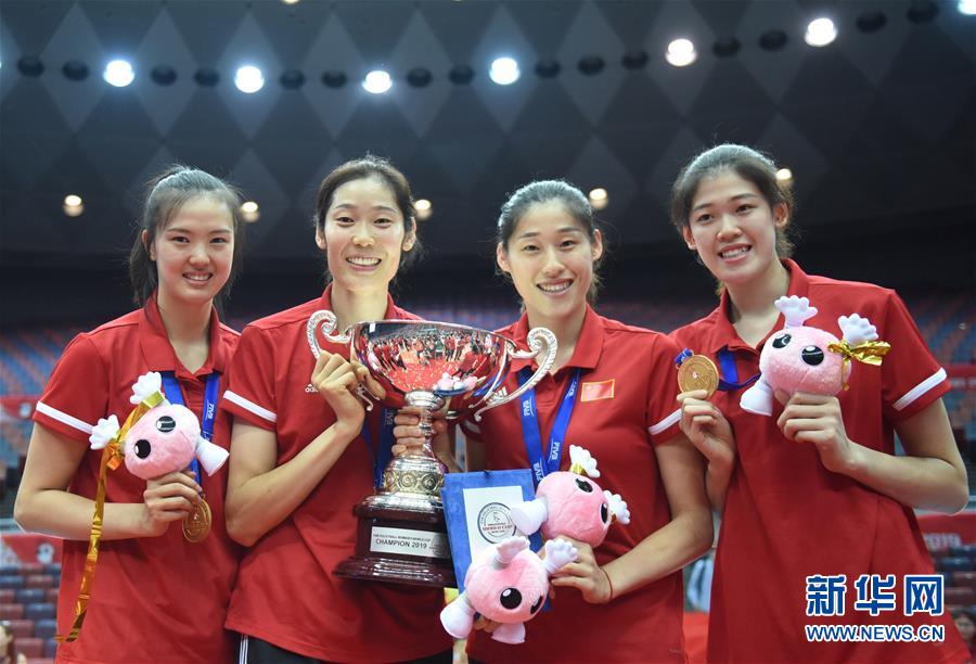 9月29日,中國隊球員張常寧、朱婷、劉曉彤、李盈瑩(從左至右)在頒獎儀式上合影。新華社記者賀燦鈴攝