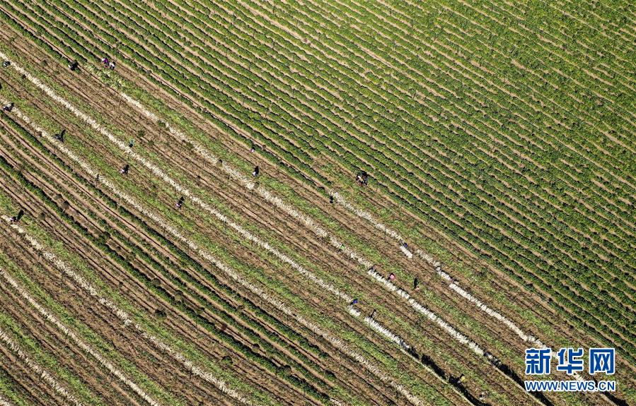 9月30日,寧夏吳忠市紅寺堡區(qū)馬渠生態(tài)移民安置區(qū)的農(nóng)民在蘿卜地里勞作(無人機(jī)拍攝)。