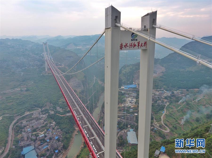 9月30日無(wú)人機(jī)拍攝的赤水河紅軍大橋。新華社記者劉坤攝