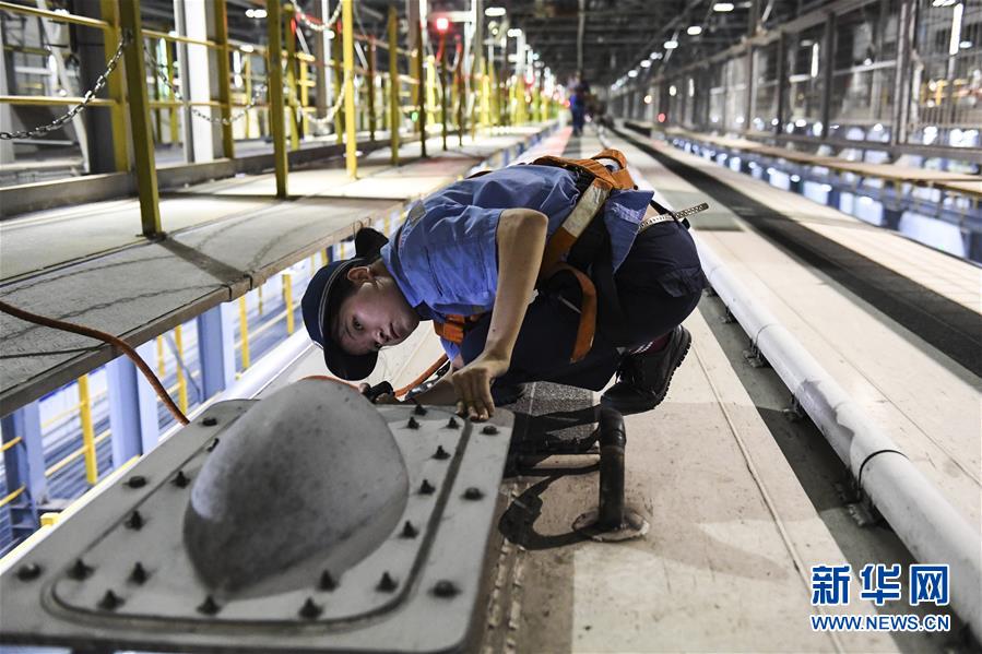 “動(dòng)車(chē)醫(yī)生”在對(duì)車(chē)頂?shù)腇M天線(xiàn)進(jìn)行檢查(10月2日攝)。 新華社記者 曹祎銘 攝