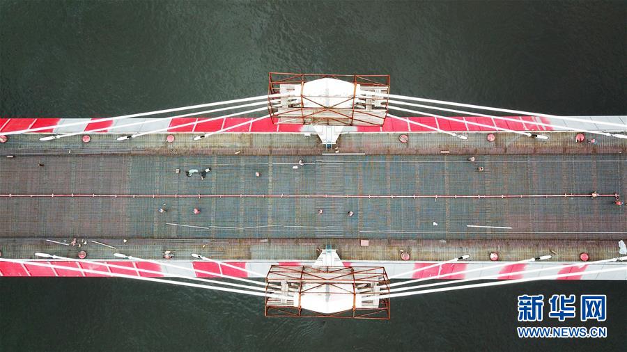 正在進行橋面鋪裝施工作業(yè)的黑河到布拉戈維申斯克黑龍江(阿穆爾河)大橋(8月19日無人機拍攝)。新華社記者 王建威 攝