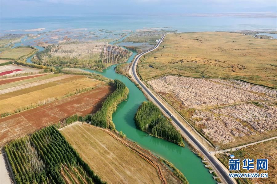 開(kāi)都河支流匯入博斯騰湖(10月12日無(wú)人機(jī)拍攝)。入秋以來(lái),新疆博斯騰湖碧波蕩漾,美景如畫,吸引各地游客前來(lái)游玩。新華社記者丁磊攝