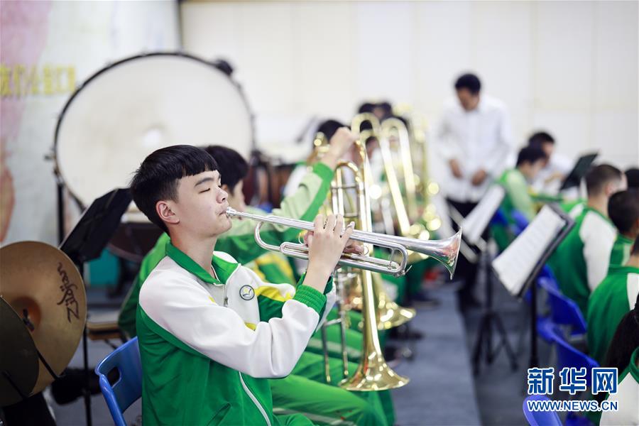 重慶市特殊教育中心排練廳,學(xué)生在排練開始前練習(xí)小號(hào)(10月9日攝)。 新華社記者 劉潺 攝