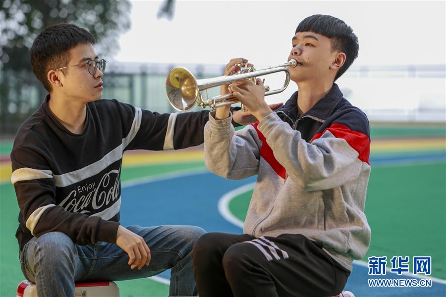 王太樊在教室外的樓道給自己心愛的小號(hào)試音(10月10日攝)。 新華社記者 劉潺 攝