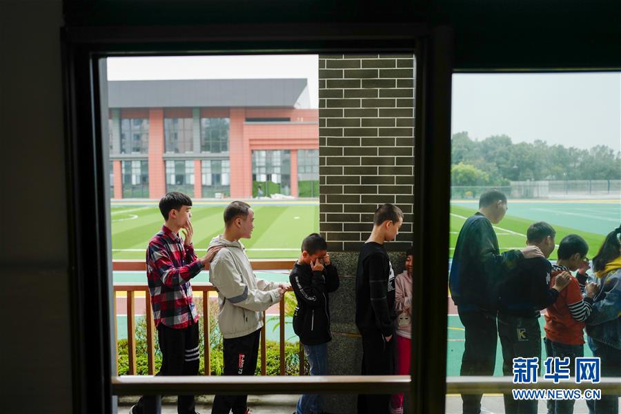 重慶市特殊教育中心的樓道里,王太樊(左一)和同學(xué)們相互搭著肩膀排隊(duì)進(jìn)入食堂吃午飯(10月10日攝)。 新華社記者 劉潺 攝