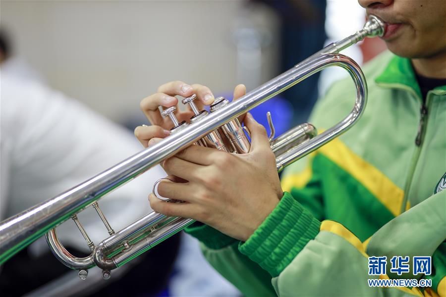 重慶市特殊教育中心排練廳,學(xué)生在排練開(kāi)始前練習(xí)小號(hào)(10月9日攝)。 新華社記者 劉潺 攝