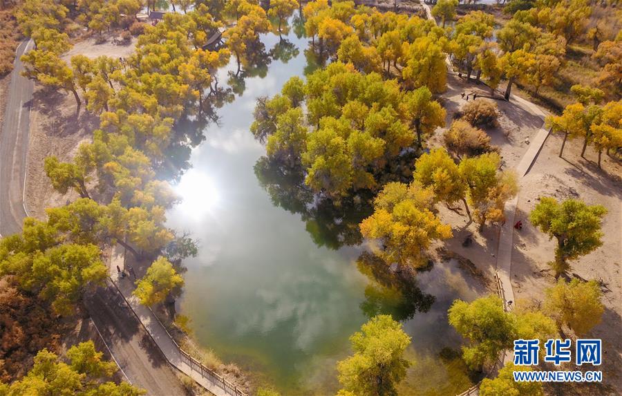 10月16日無人機(jī)拍攝的內(nèi)蒙古阿拉善盟額濟(jì)納旗境內(nèi)的胡楊林。新華社記者彭源攝