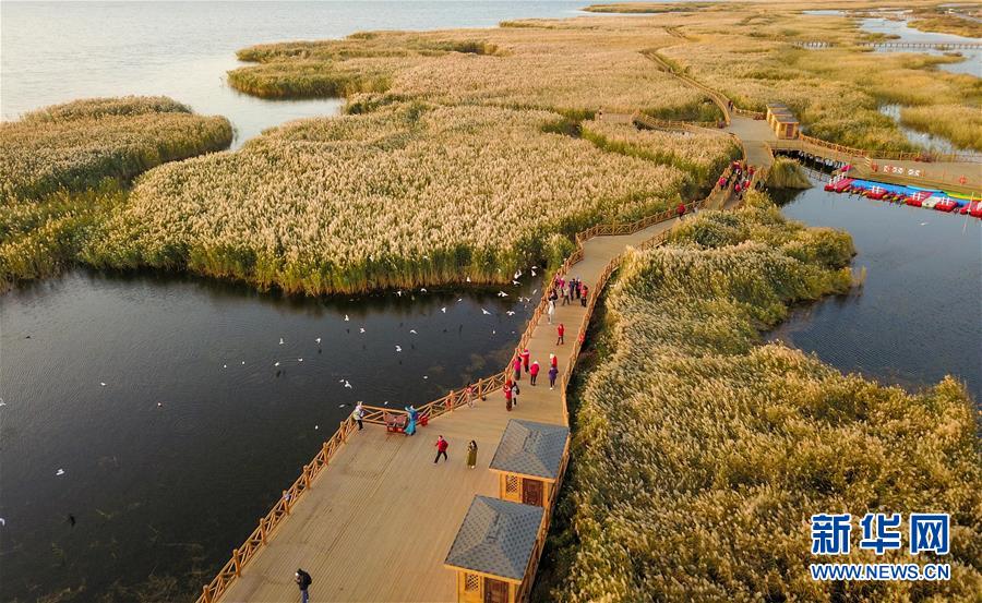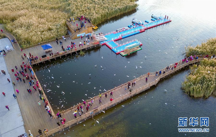10月17日,游客在居延海岸邊的木棧道上觀賞水鳥(niǎo)。新華社記者 彭源 攝