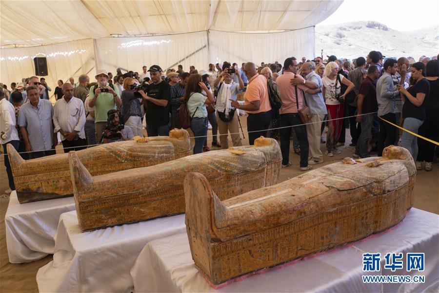 這是10月19日在埃及盧克索拍攝的近期發(fā)掘出的棺槨。 埃及文物部19日在南部城市盧克索舉行的新聞發(fā)布會(huì)上宣布,埃及考古隊(duì)近期發(fā)掘出30具3000年前的木質(zhì)棺槨。 新華社記者 李碧念 攝