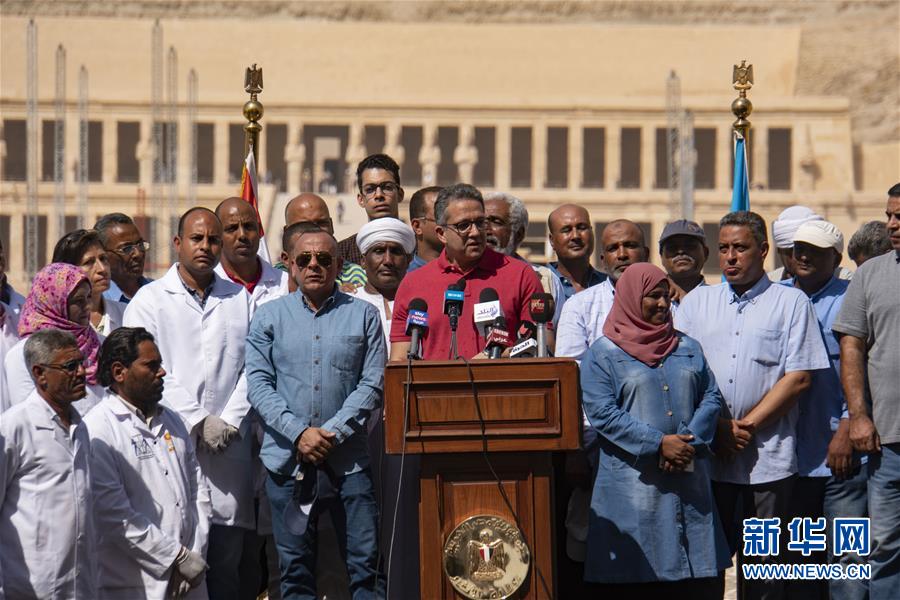 10月19日,在埃及盧克索,埃及文物部長哈立德·阿納尼在新聞發(fā)布會(huì)上講話。 埃及文物部19日在南部城市盧克索舉行的新聞發(fā)布會(huì)上宣布,埃及考古隊(duì)近期發(fā)掘出30具3000年前的木質(zhì)棺槨。 新華社記者 李碧念 攝