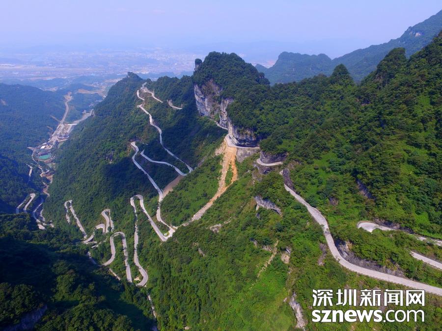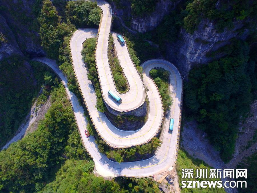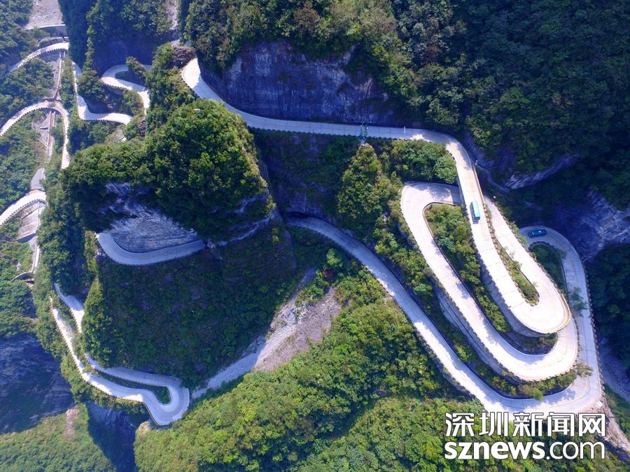 天門(mén)山盤(pán)山公路位于湖南省張家界市境內(nèi)的國(guó)家森林公園天門(mén)山上,盤(pán)山公路全長(zhǎng)10.77公里,海拔從200米急劇提升到1300米,大道兩側(cè)絕壁千仞,空谷幽深,共計(jì)99個(gè)彎,180度急彎此消彼長(zhǎng),似玉帶環(huán)繞,航拍鏡頭下蜿蜒曲折的道路彎彎緊連,層層迭起,宛如迷宮般的“納斯卡線條”,被譽(yù)為“天下第一公路奇觀”,同時(shí)它也是世界上最危險(xiǎn)的十大公路之一。