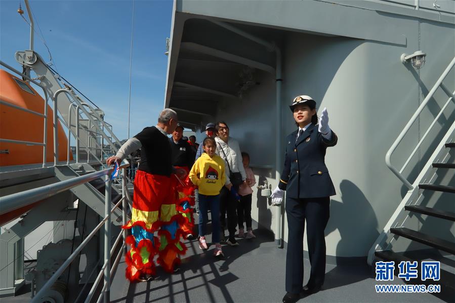 10月26日,在新西蘭首都惠靈頓,中國海軍訓(xùn)練艦戚繼光艦的學(xué)員為參觀群眾進(jìn)行講解。新華社發(fā)(張雪山攝)