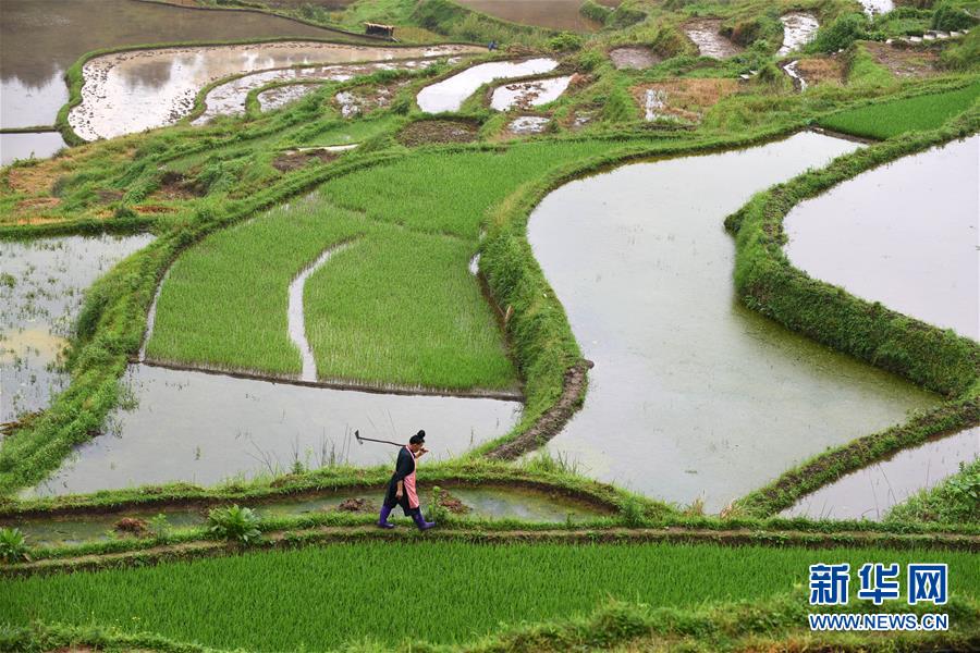 5月18日,農(nóng)民從貴州省丹寨縣龍泉鎮(zhèn)高要梯田里走過。初夏時(shí)節(jié),位于貴州省丹寨縣龍泉鎮(zhèn)的高要梯田景色優(yōu)美。新華社記者楊文斌攝