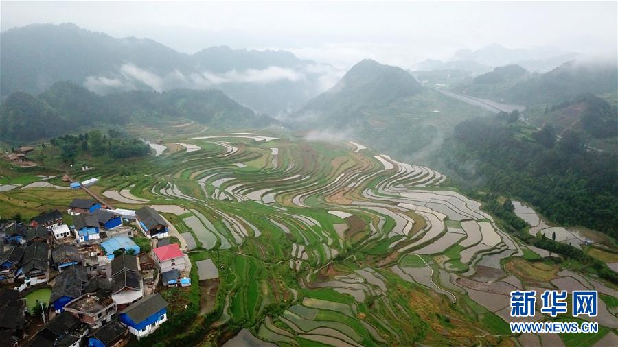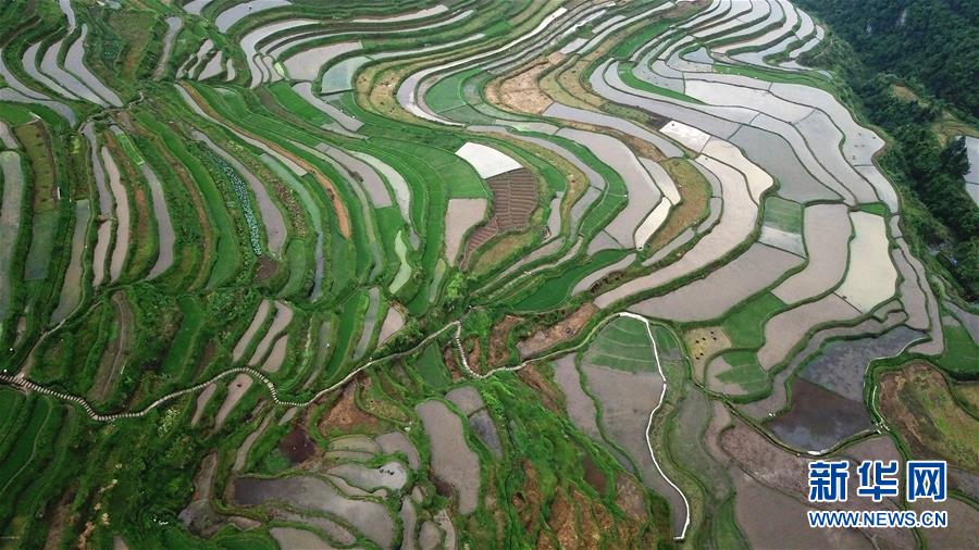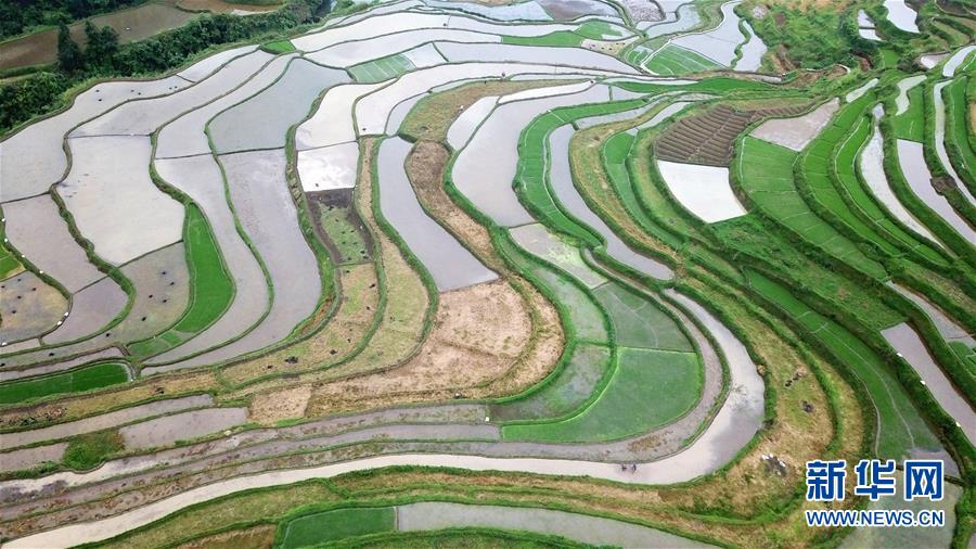5月18日,農(nóng)民在貴州省丹寨縣龍泉鎮(zhèn)高要梯田里勞作。初夏時(shí)節(jié),位于貴州省丹寨縣龍泉鎮(zhèn)的高要梯田景色優(yōu)美。新華社記者楊文斌攝