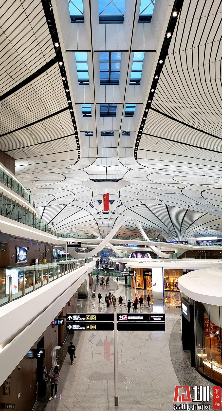 北京大興機(jī)場橫跨兩市,距離天安門46公里,首都機(jī)場67公里,北京城市副中心54公里。見圳客戶端、深圳新聞網(wǎng)記者劉東博攝