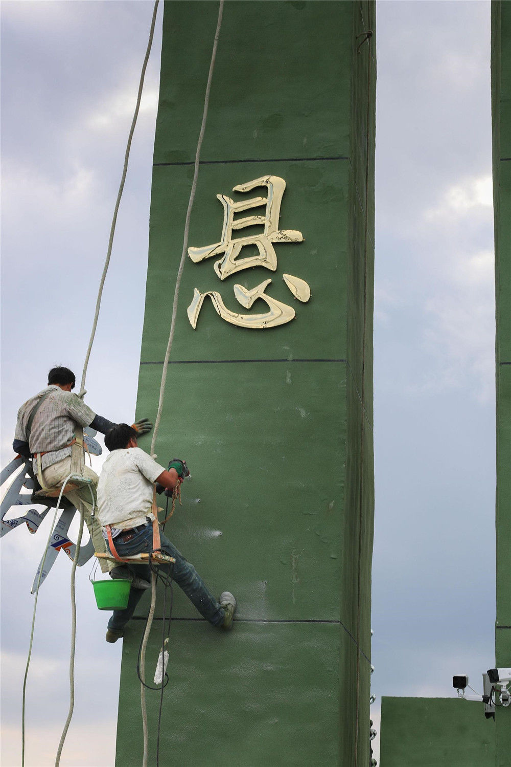 2019年9月20日,從落差198米懸崖上伸出周長(zhǎng)60米懸空的“高空玻璃懸廊”在河南南陽(yáng)七峰山落成,該玻璃懸廊名為“云頂之心”。圖為建筑工人進(jìn)行收尾工作。王中舉(河南分社)/中新社/視覺(jué)中國(guó)編輯/康娜
