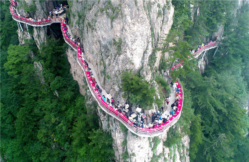 2019年6月24日,河北省邯鄲市東太行云端棧道天脊攬勝。東太行景區(qū)位于武安市境內(nèi)太行山東麓,登山棧道全部在峭壁上,游人登山如在云端漫步。金書懷/視覺(jué)中國(guó)