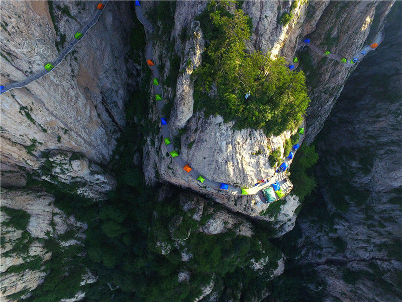 2018年7月21日,河南洛陽(yáng)老君山,一年一度的帳篷節(jié)開(kāi)幕,驢友在海拔2000余米的懸崖棧道上安營(yíng)扎寨。DF/視覺(jué)中國(guó)