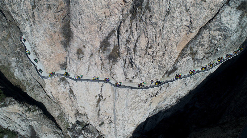 2018年4月3日,河南洛陽(yáng),志愿者在千米懸崖棧道上“飛檐走壁”,騎共享電車呼吁環(huán)保。DF/視覺中國(guó)