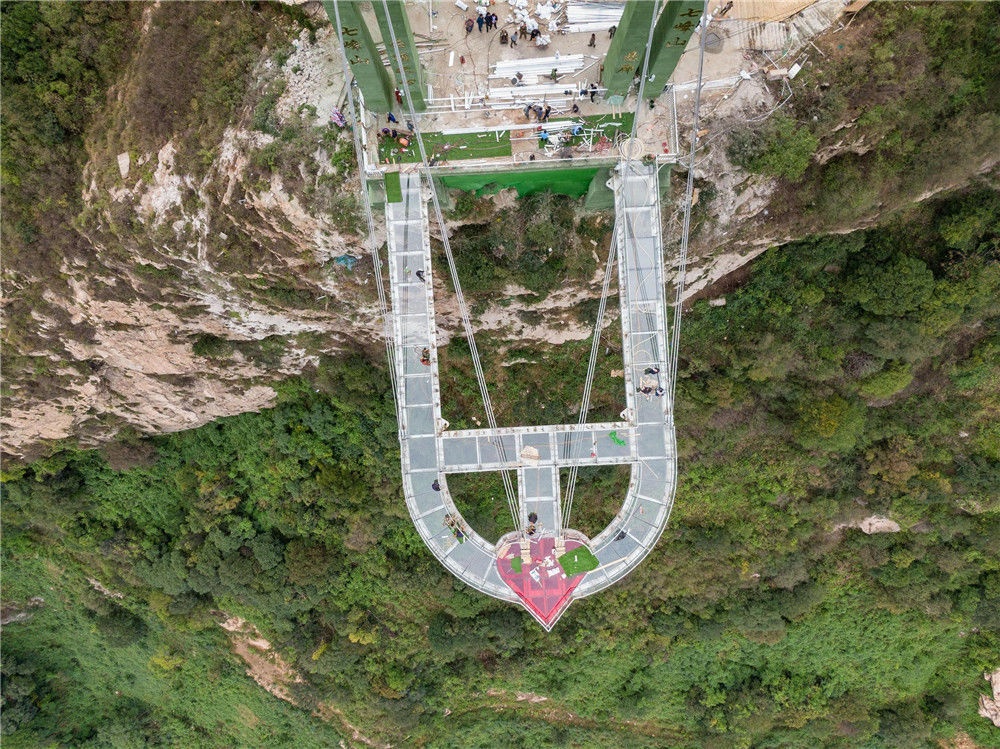 2019年9月20日,從落差198米懸崖上伸出周長(zhǎng)60米懸空的“高空玻璃懸廊”在河南南陽(yáng)七峰山落成,該玻璃懸廊名為“云頂之心”。
