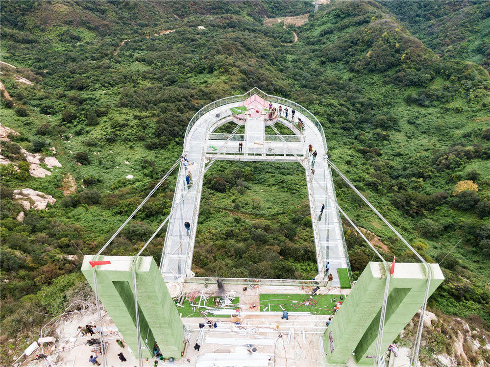 2019年9月20日,從落差198米懸崖上伸出周長(zhǎng)60米懸空的“高空玻璃懸廊”在河南南陽七峰山落成,該玻璃懸廊名為“云頂之心”。