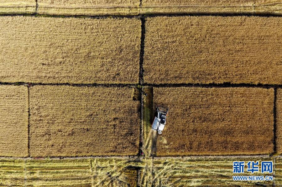 收割機(jī)在太原市晉源區(qū)赤橋村稻田里作業(yè)(10月28日無人機(jī)拍攝)。新華社記者詹彥攝