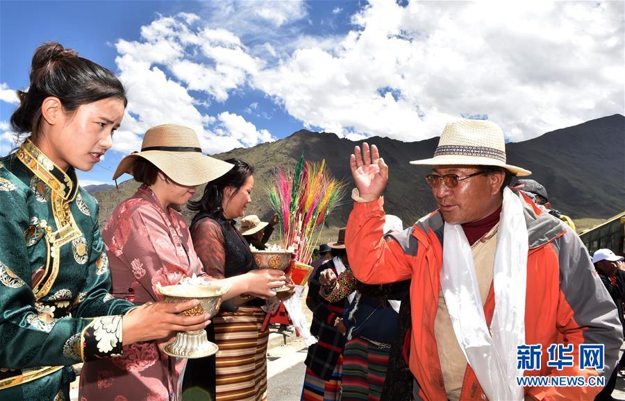 向來自遠(yuǎn)方的新鄰居敬獻(xiàn)青稞酒(2018年6月18日攝)。經(jīng)過兩天的馳騁,11輛大巴和31輛大貨車緩緩駛?cè)肜_市堆龍德慶區(qū)古榮鄉(xiāng)嘎沖村,標(biāo)志著西藏首個高海拔生態(tài)搬遷項(xiàng)目正式實(shí)施。新華社記者覺果攝