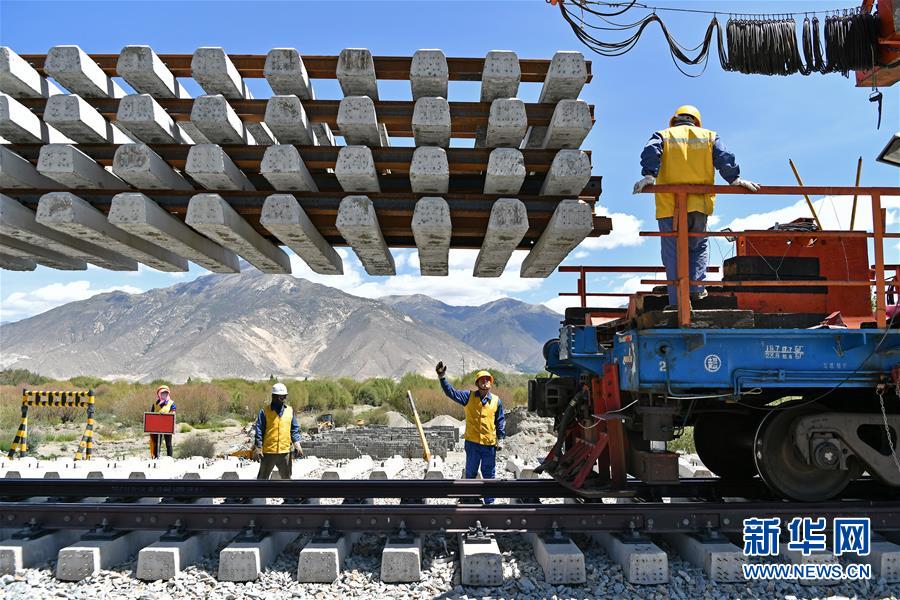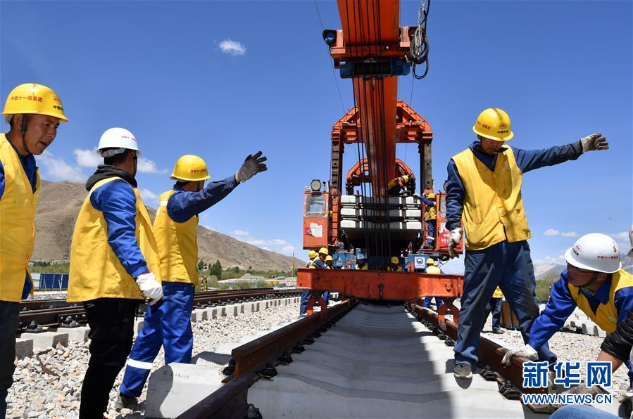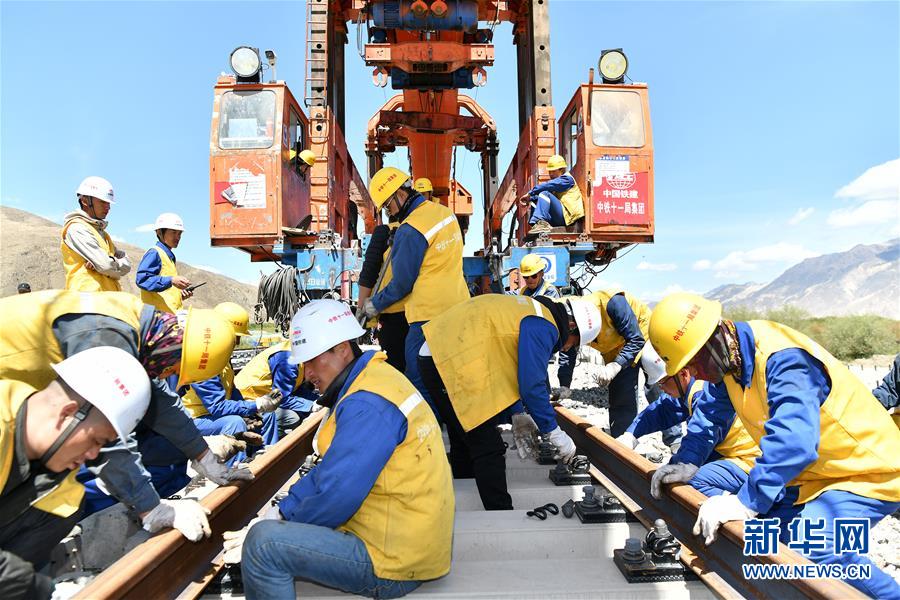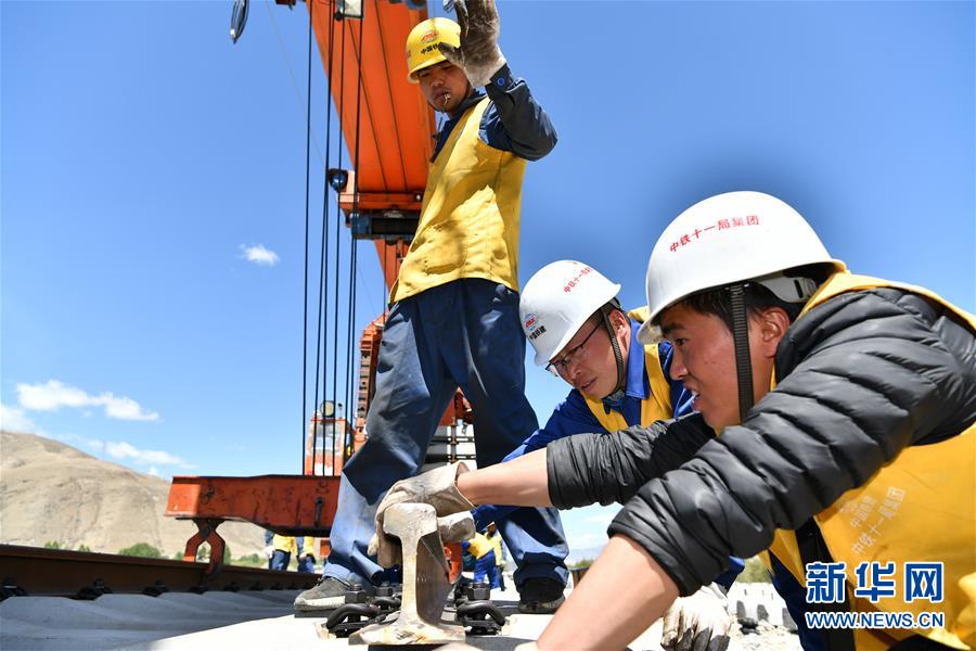 6月6日,負(fù)責(zé)鋪軌的中鐵十一局集團(tuán)的建設(shè)者在現(xiàn)場作業(yè)。新華社記者普布扎西攝
