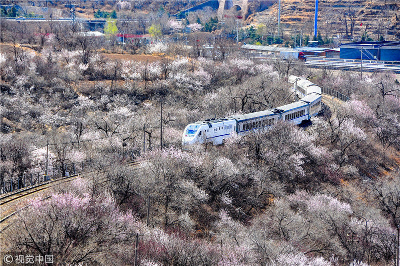 2019年3月22日,北京居庸關(guān)附近的山花盛開,S2線列車穿行在花海之中,構(gòu)成一幅美麗的畫面。時永平/千龍圖像/視覺中國編輯/陳進(jìn)