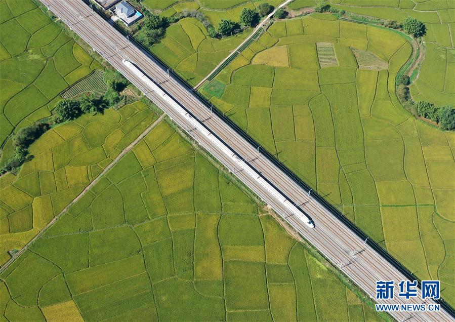 10月29日,列車從廣西賓陽(yáng)縣古辣鎮(zhèn)豐收的稻田間駛過(guò)(無(wú)人機(jī)拍攝)。新華社記者陸波岸攝