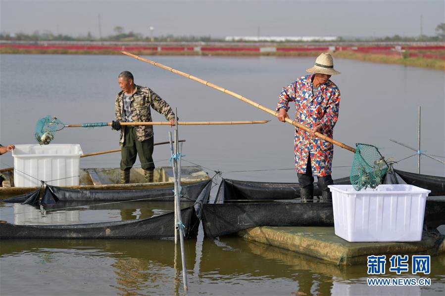 江西省南昌市新建區(qū)象山鎮(zhèn)河林村的農(nóng)戶正在大閘蟹養(yǎng)殖基地進(jìn)行捕撈(10月29日無(wú)人機(jī)拍攝)。 時(shí)下正值大閘蟹收獲的季節(jié),江西省南昌市新建區(qū)象山鎮(zhèn)河林村的村民忙著進(jìn)行大閘蟹的捕撈、包裝和外銷工作。近年來(lái),當(dāng)?shù)匾劳休爡^(qū)內(nèi)河道縱橫、水田眾多的資源優(yōu)勢(shì),支持鼓勵(lì)當(dāng)?shù)剞r(nóng)村引進(jìn)發(fā)展大閘蟹養(yǎng)殖業(yè),目前已有大閘蟹特色養(yǎng)殖基地300余畝,年產(chǎn)值超過200萬(wàn)元,為當(dāng)?shù)剞r(nóng)戶開辟一條特色養(yǎng)殖的致富路。 新華社記者 彭昭之 攝