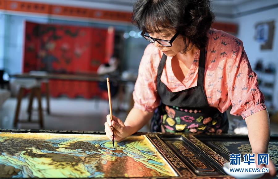 北京金漆鑲嵌有限責(zé)任公司工藝美術(shù)大師胡昕在創(chuàng)作漆畫屏風(fēng)(9月19日攝)。新華社記者李欣攝