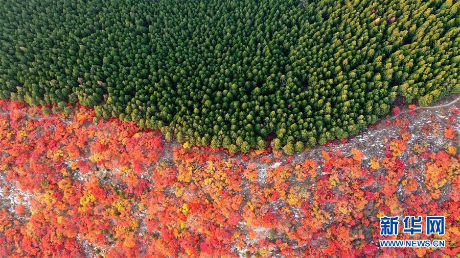 火紅的黃櫨樹(shù)林與綠色的松林沿濟(jì)南蝎子山山脊分布(11月4日無(wú)人機(jī)拍攝)。 新華社記者 朱崢 攝