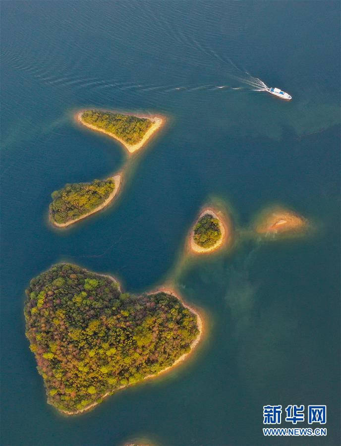 11月9日無人機拍攝的廬山西海。 當(dāng)日,落日余暉下的江西廬山西海山青水藍,美不勝收。 新華社記者 周密 攝