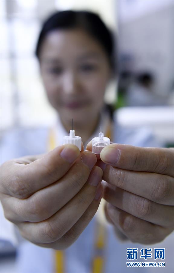 在第二屆進(jìn)博會醫(yī)療器械及醫(yī)藥保健展區(qū),工作人員展示全球最細(xì)胰島素注射針頭“納諾斯Jr.”(右)與普通針頭的對比(11月7日攝)。新華社記者王鵬攝